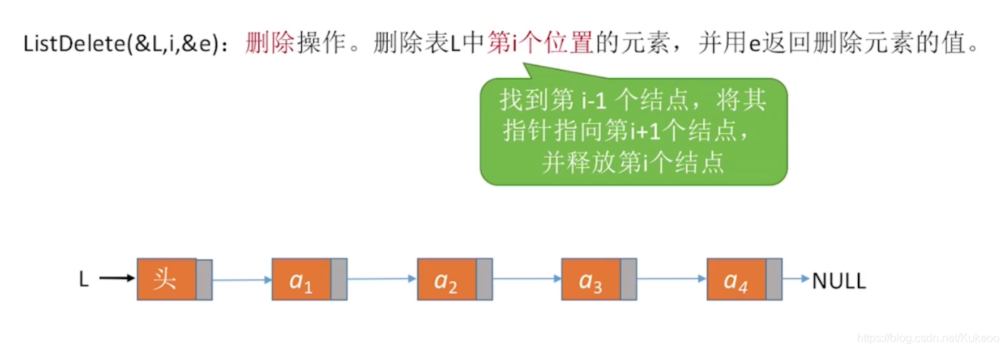 LinkedList LinkedListDelete(LinkedList L, int i){ if (i < 1) cout << "请输入大于等于1的正整数!" << endl; Node* pre; pre = L; int tempi = 0; for(tempi = 1;tempi < i;tempi++) { pre = pre->next; } Node* p = pre->next; pre->next = p->next; free(p); return L;} 这里还是先找到位序元素的前一个元素,